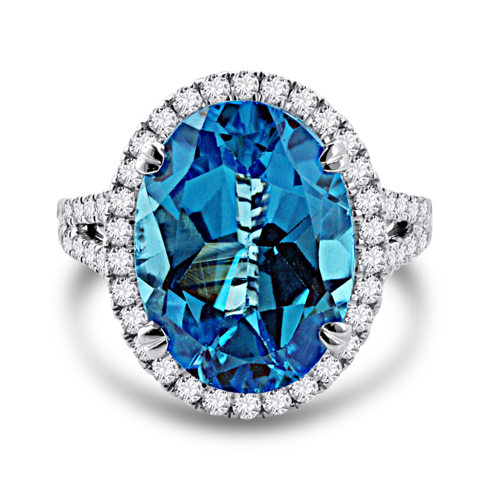 14K WHITE GOLD BLUE TOPAZ WHITE DIAMOND RING