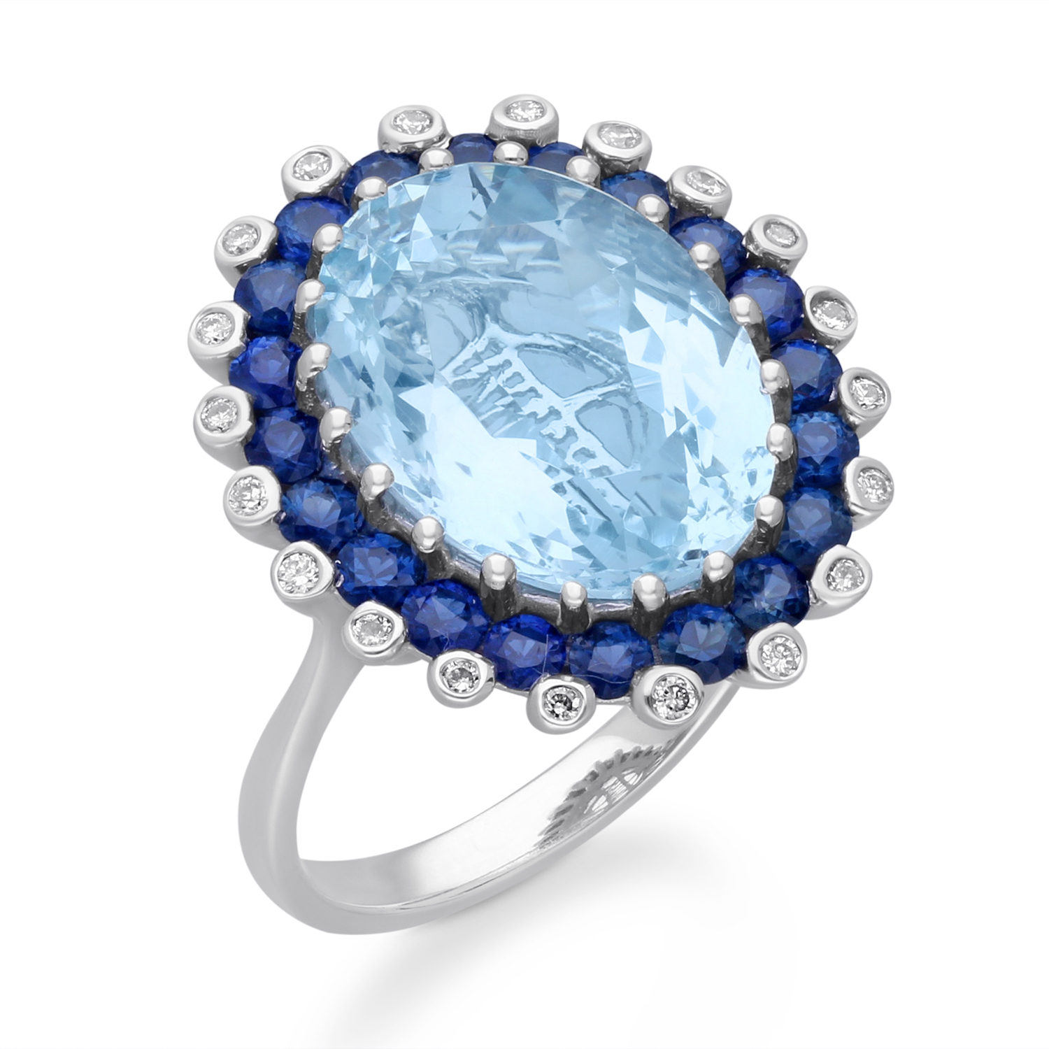14K WHITE GOLD AQUA MARINE & SAPPHIRE WITH WHITE DIAMOND FASHION RING