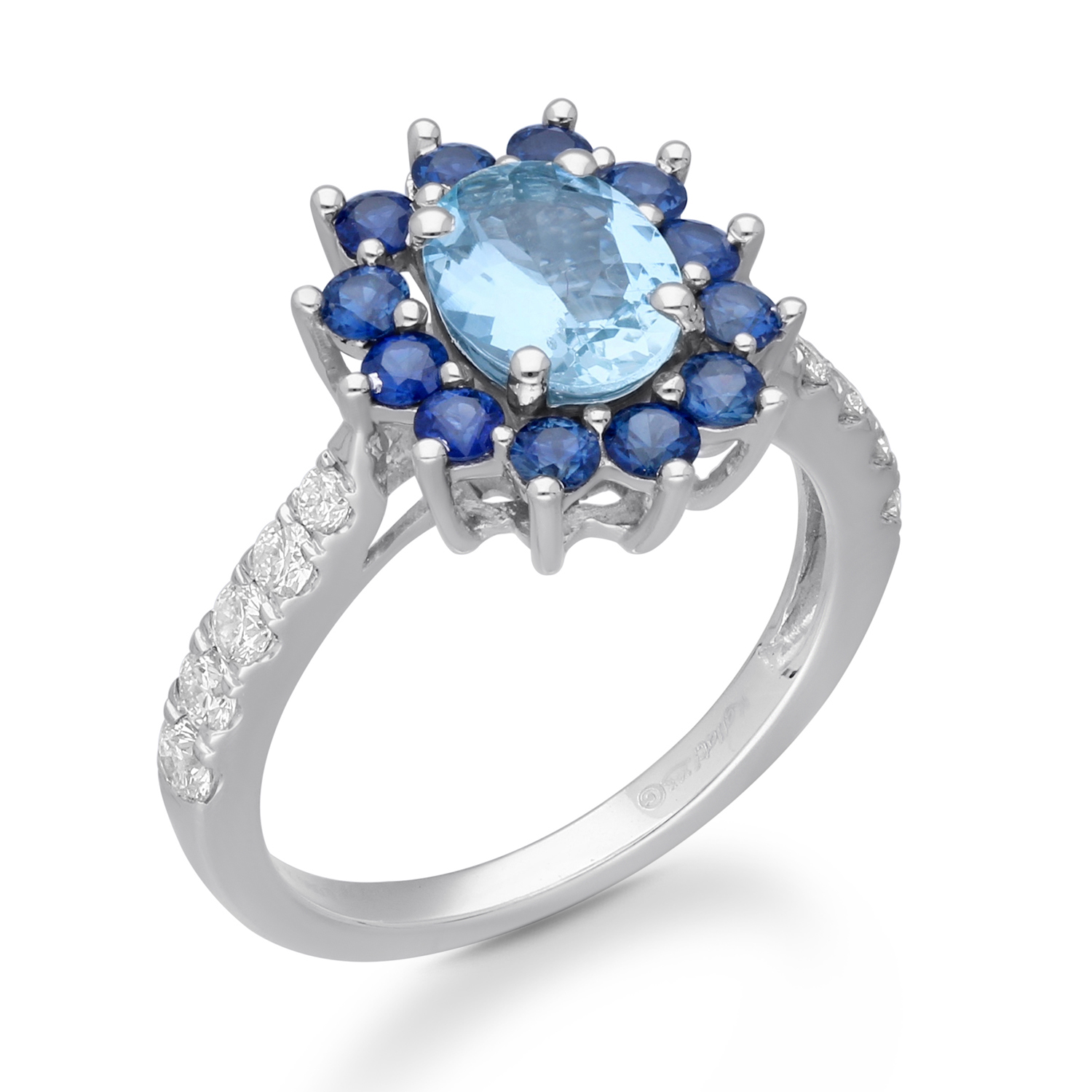 14K WHITE GOLD AQUA MARINE & SAPPHIRE WITH WHITE DIAMOND FASHION RING
