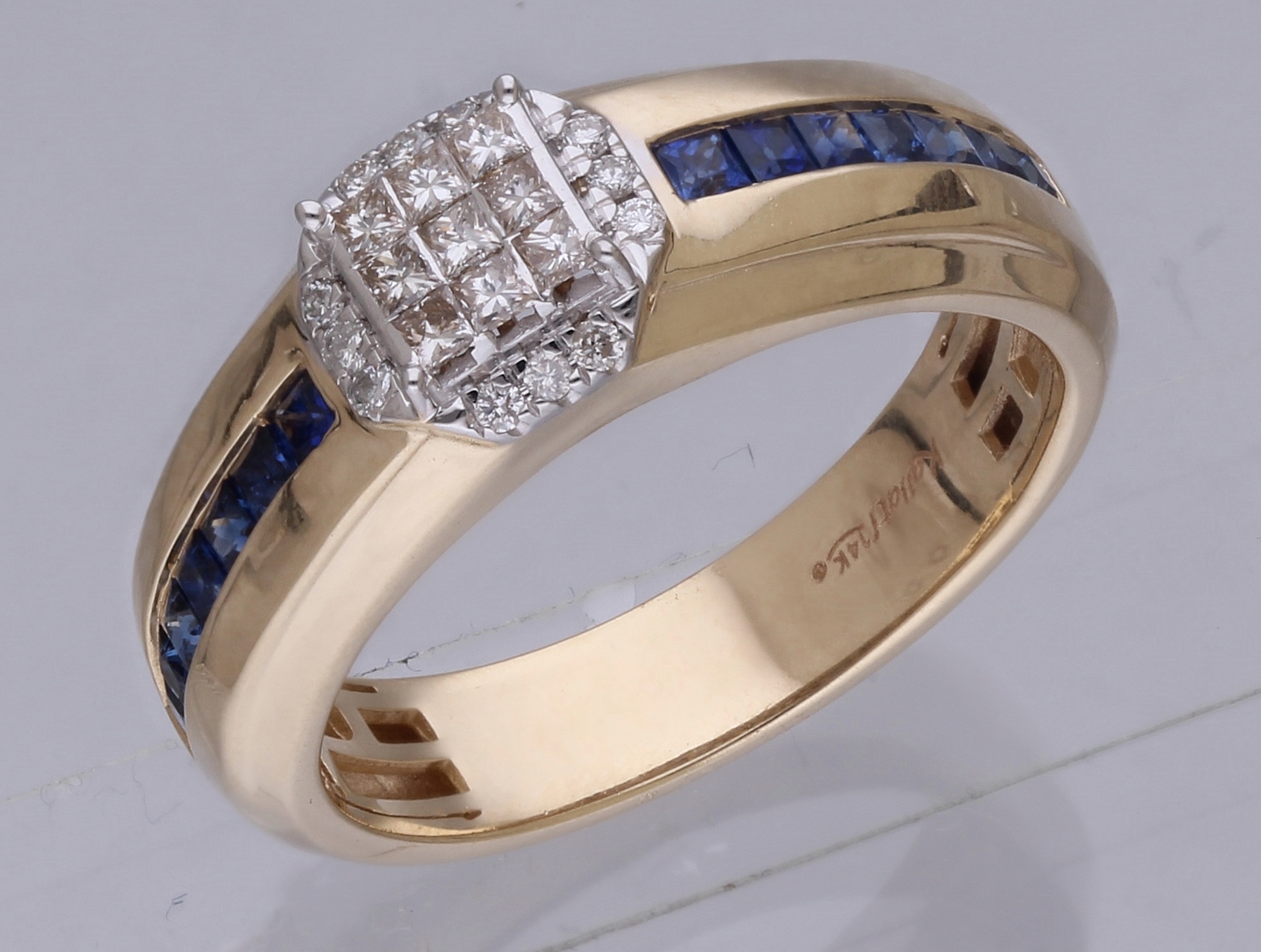 14K YELLOW GOLD BLUE SAPPHIRE & WHITE DIAMOND MENS RING