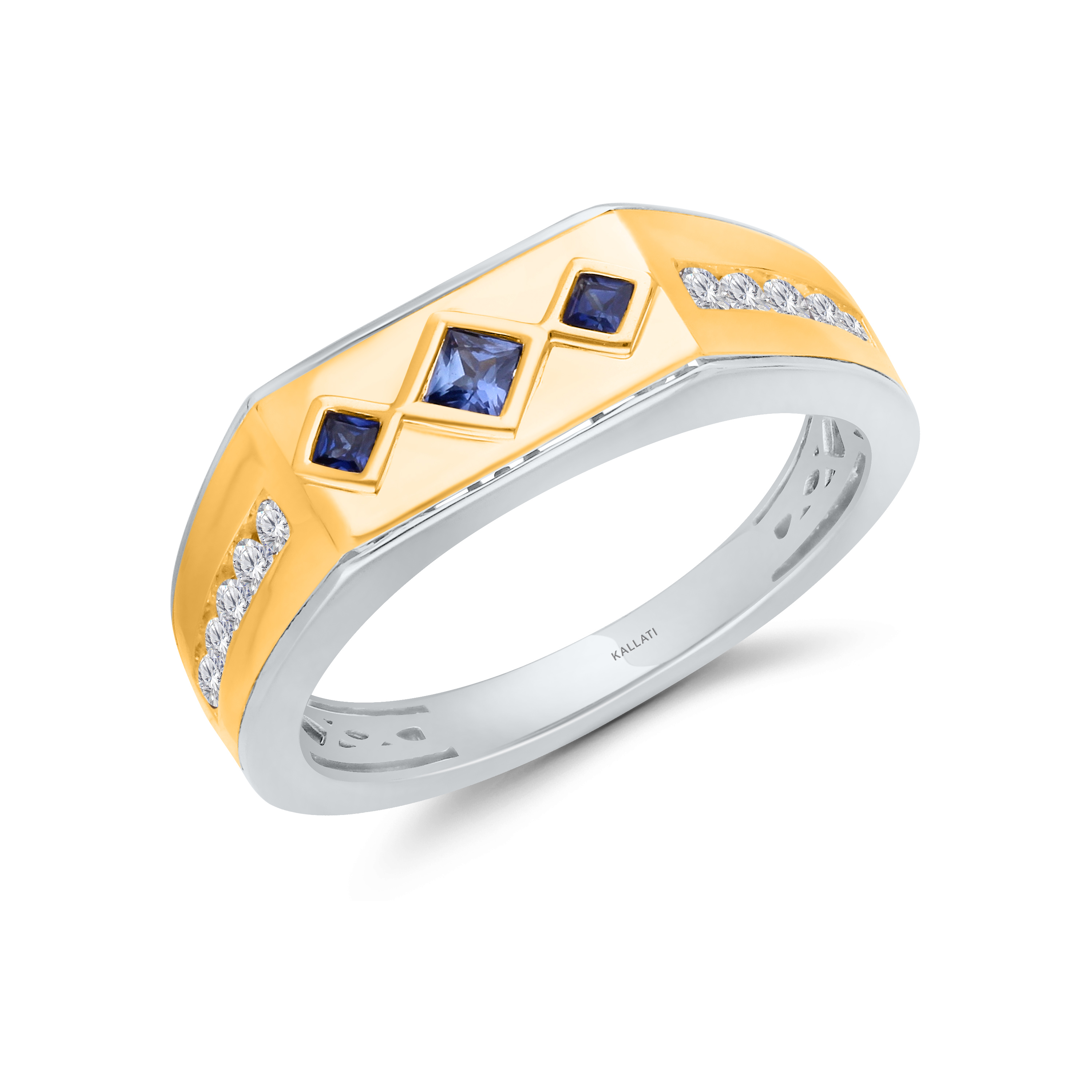 14K YELLOW GOLD BLUE SAPPHIRE AND WHITE DIAMOND MENS RING
