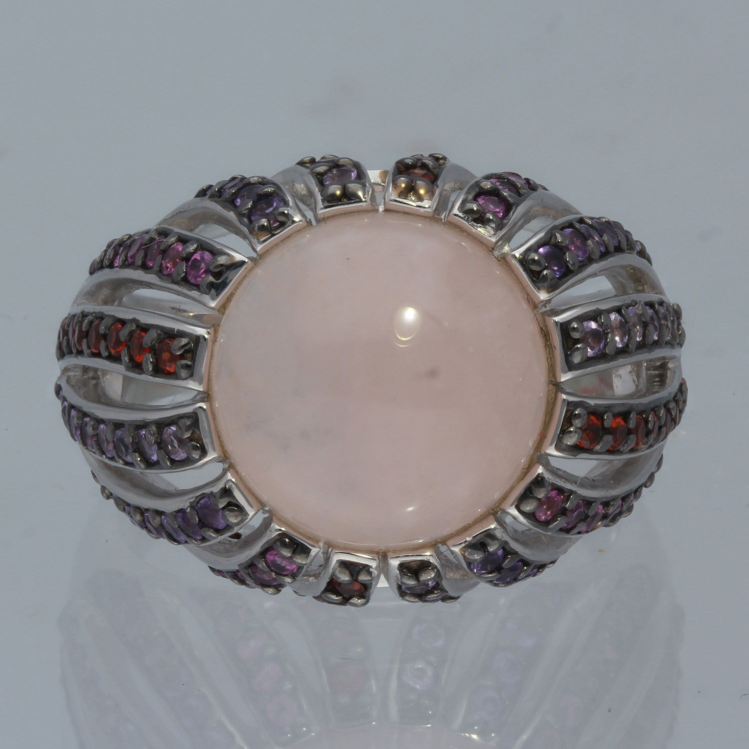 SILVER ROUND ROSE QUARTZ FASHION RING
